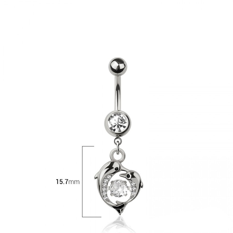 SS316L Jewelled Fancy Banana Bar with CZ Dolphin Love Heart Dangle - 571