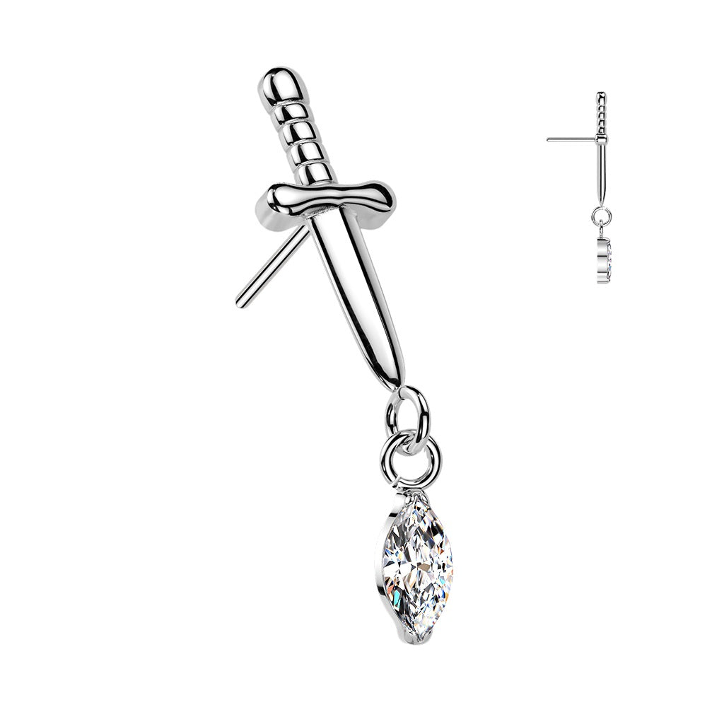 Titanium High Polish Dagger with Crystal Marquise Dangle Threadless Push In Top (Base Sold Separately) - TT254